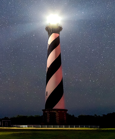 As the tallest brick lighthouse in North America, Cape Hatteras Lighthouse is an Outer Banks landmark. Its unique views and design, with black and white stripes, make it a must-see for Hatteras Island visitors. This lighthouse has a fascinating history that includes nature, seascape, and innovation. Adjacent to the Cape Hatteras Lighthouse, you'll find the Hatteras Island Visitor Center and Museum of the Sea. Stop in at the museum and peruse the gift shop.